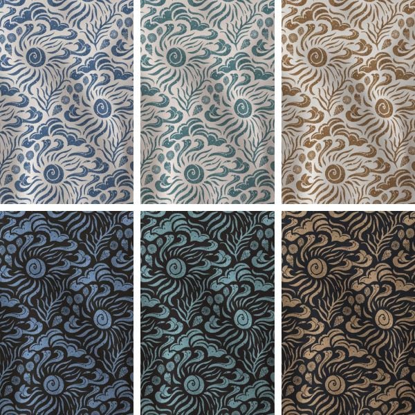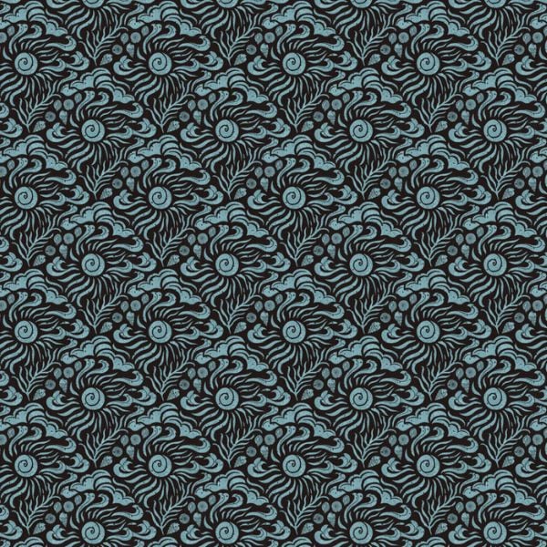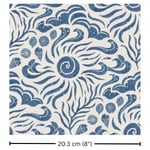 Flowing, hand-drawn waves swirl around stylized sea shells and sunny skies, in a repeating diamond pattern. Rendered in soft blues, sandy browns, and sea teal green, it evokes a calm, coastal feel with a vintage bohemian vibe.