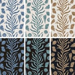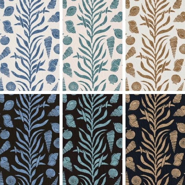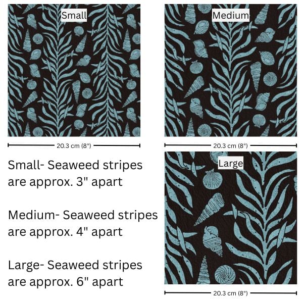 Flowing, hand-drawn seaweed swirls around stylized sea shells, in a repeating vertical stripe pattern. Rendered in soft blues, sandy browns, and sea teal green, it evokes a calm, coastal feel with a vintage bohemian vibe. Would be lovely as throw pillows, table linens, or some flowy palazzo pants.