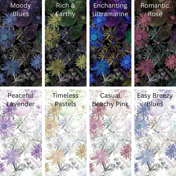 Inspired by the wide array of wildflowers found on the prairies, this piece plays with various colour palettes to create different moods from the same design, from restful and romantic to moody and mysterious.